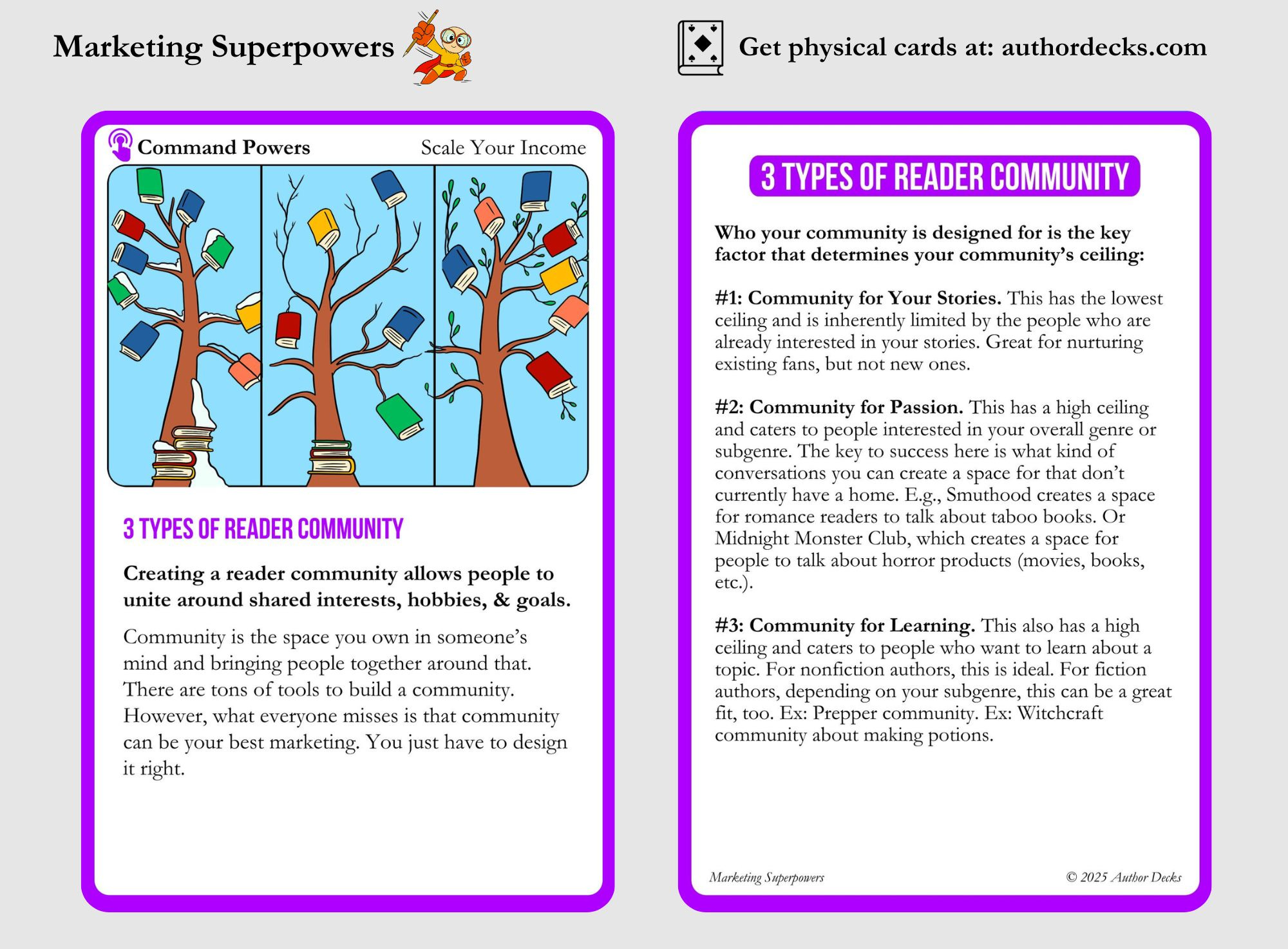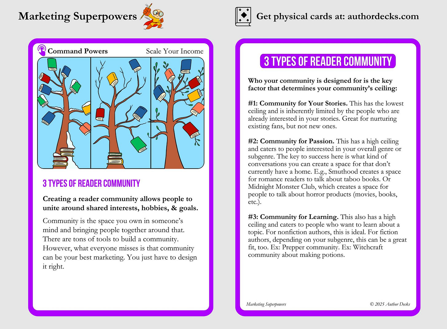 But once you understand the power, you will see just why I dedicated an entire superpower inside the 50 Author Marketing Superpowers Deck to Reader Community (which pssst… the latest shipment of physical decks just arrived. You can get yours here).