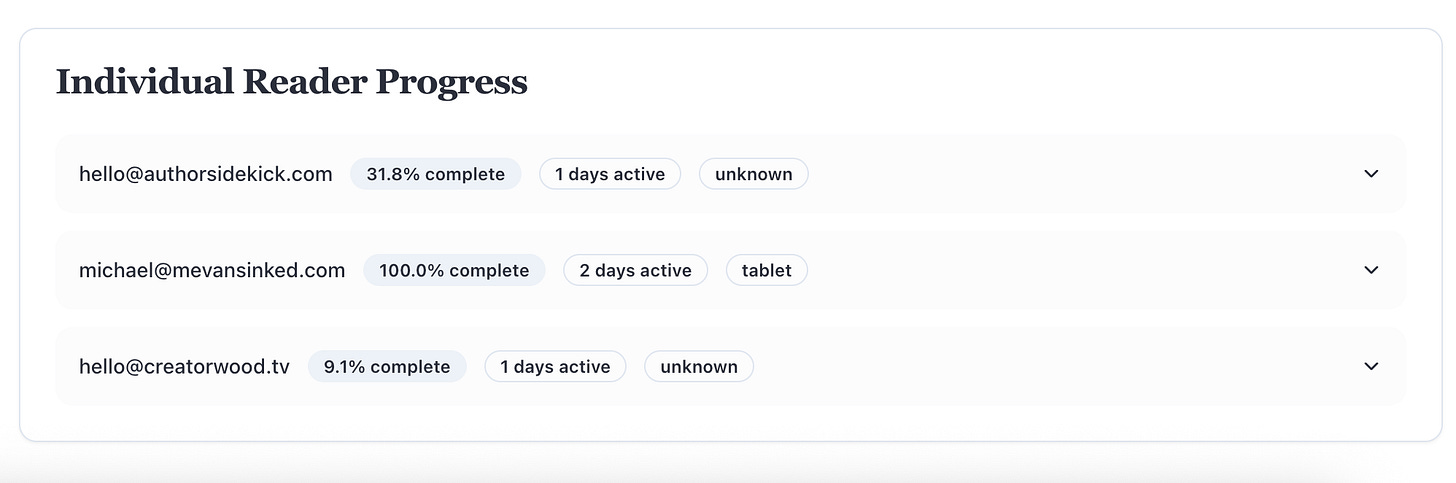 Understand every individual reader’s progress through your story (and of course, you have their emails, so you can add every reader to your mailing list… they explicitly opt-in when they begin reading your story).